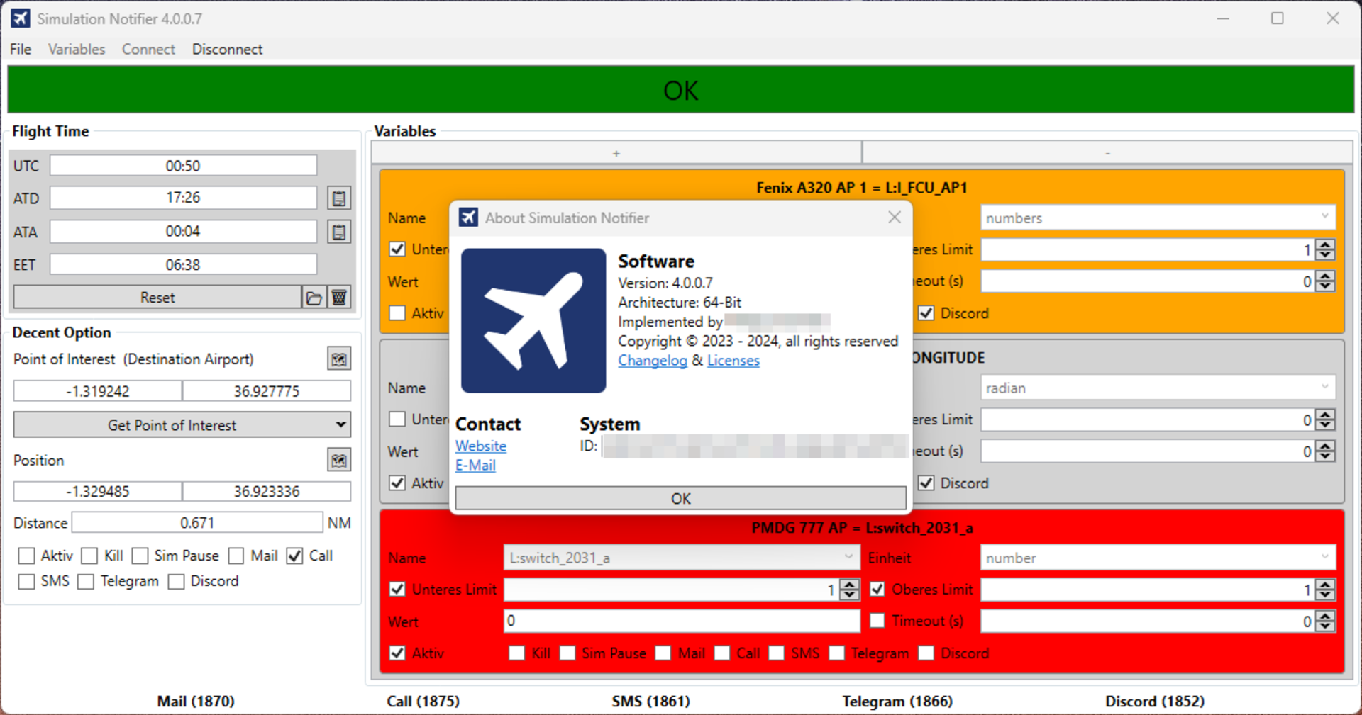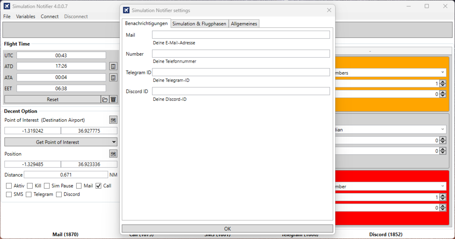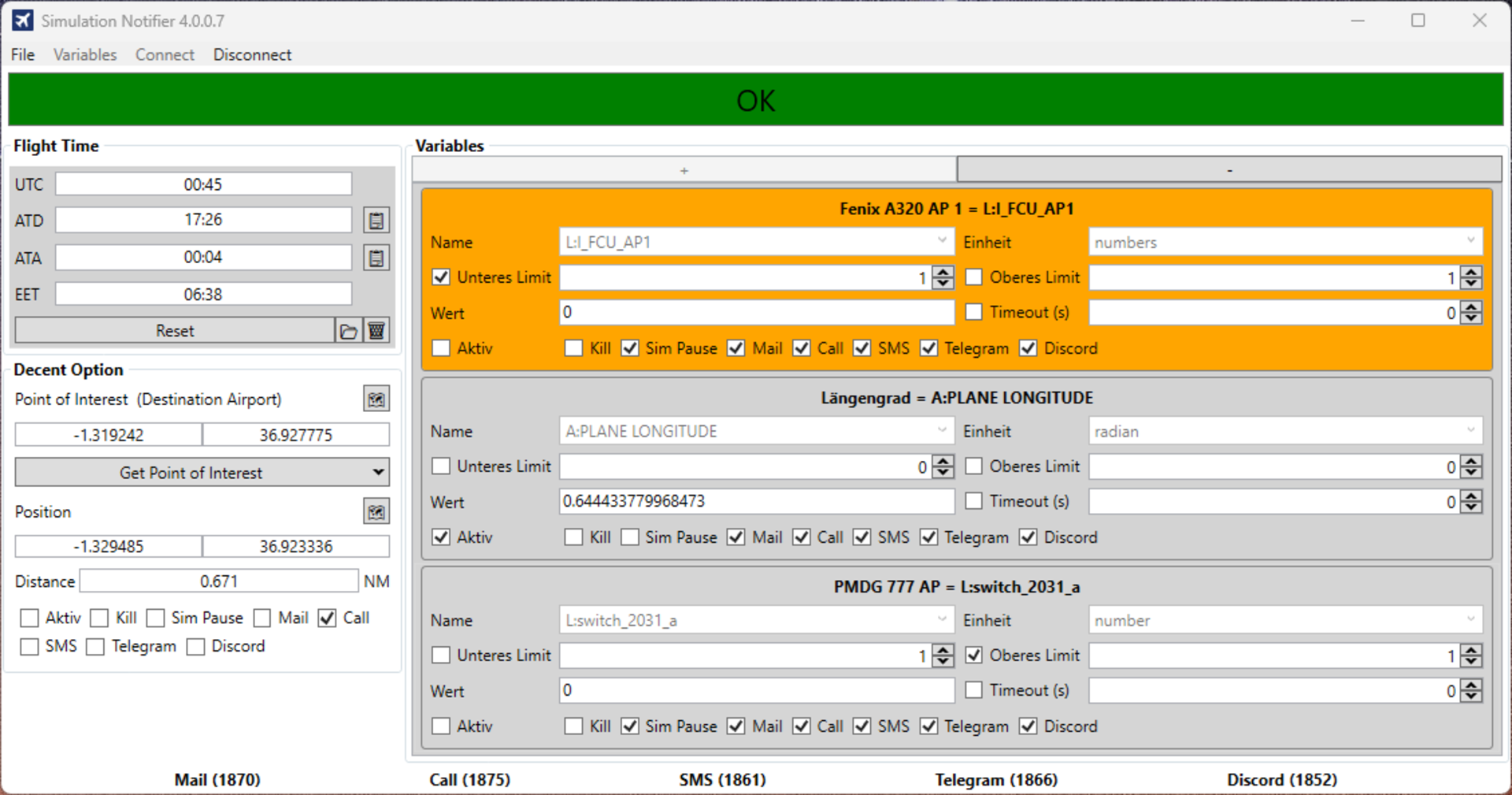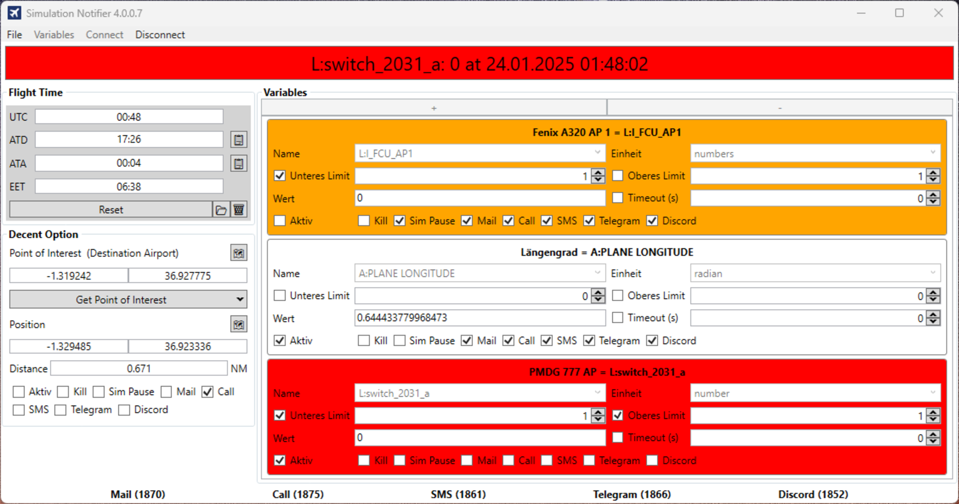 Simulation Notifier ist dein digitaler Co-Pilot für Langstreckenflüge im Microsoft Flight Simulator. Das Tool überwacht Flughöhe, Geschwindigkeit, Autopilot, Treibstoff und mehr – und benachrichtigt dich automatisch per E-Mail oder Telegram, wenn ein kritischer Zustand eintritt.